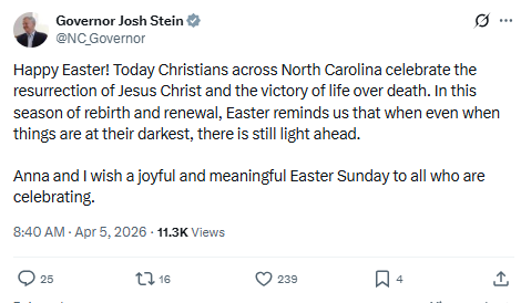 Additionally, Democrat Governor Josh Stein, who practices Judaism, exemplified the American religious pluralist tradition by recognizing Christians deeply held beliefs about Easter.
