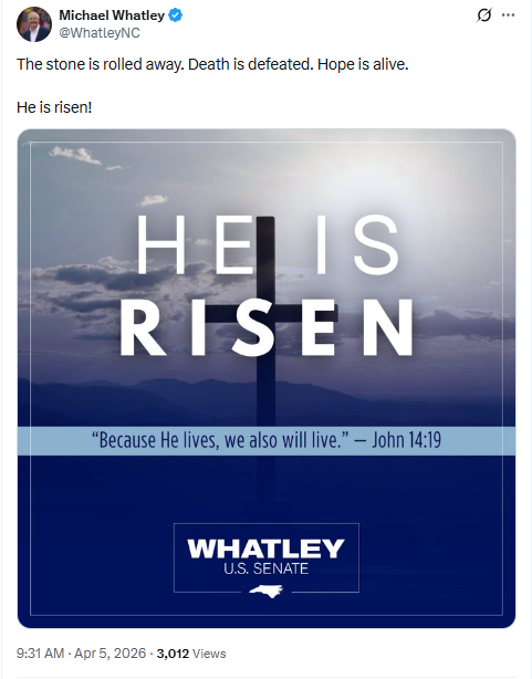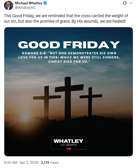 In contrast to Cooper’s Christless Easter posts, the Republican Senate Nominee, Michael Whatley, posted messages to commemorate Jesus’s death on Good Friday and celebrate the Resurrection of Jesus on Easter.
