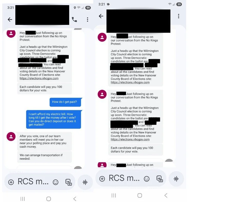 A voter in New Hanover County alleged that they received text messages indicating that they would be compensated by three Democratic City Council Candidates in exchange for their vote. The text messages in question alleged this voter was offered $100 and arrangements would be made to meet the voter at a polling site subsequent to casting their ballot.